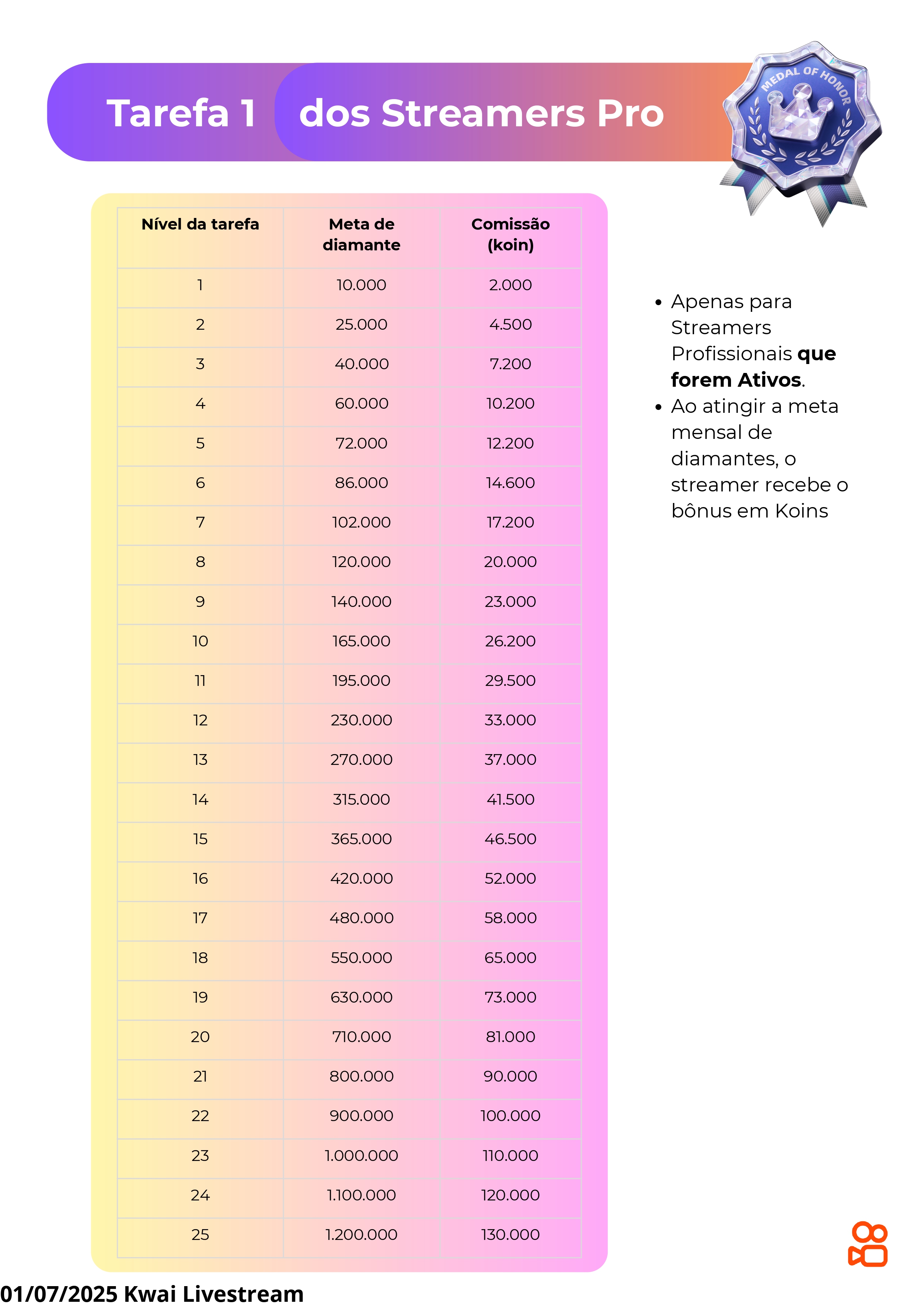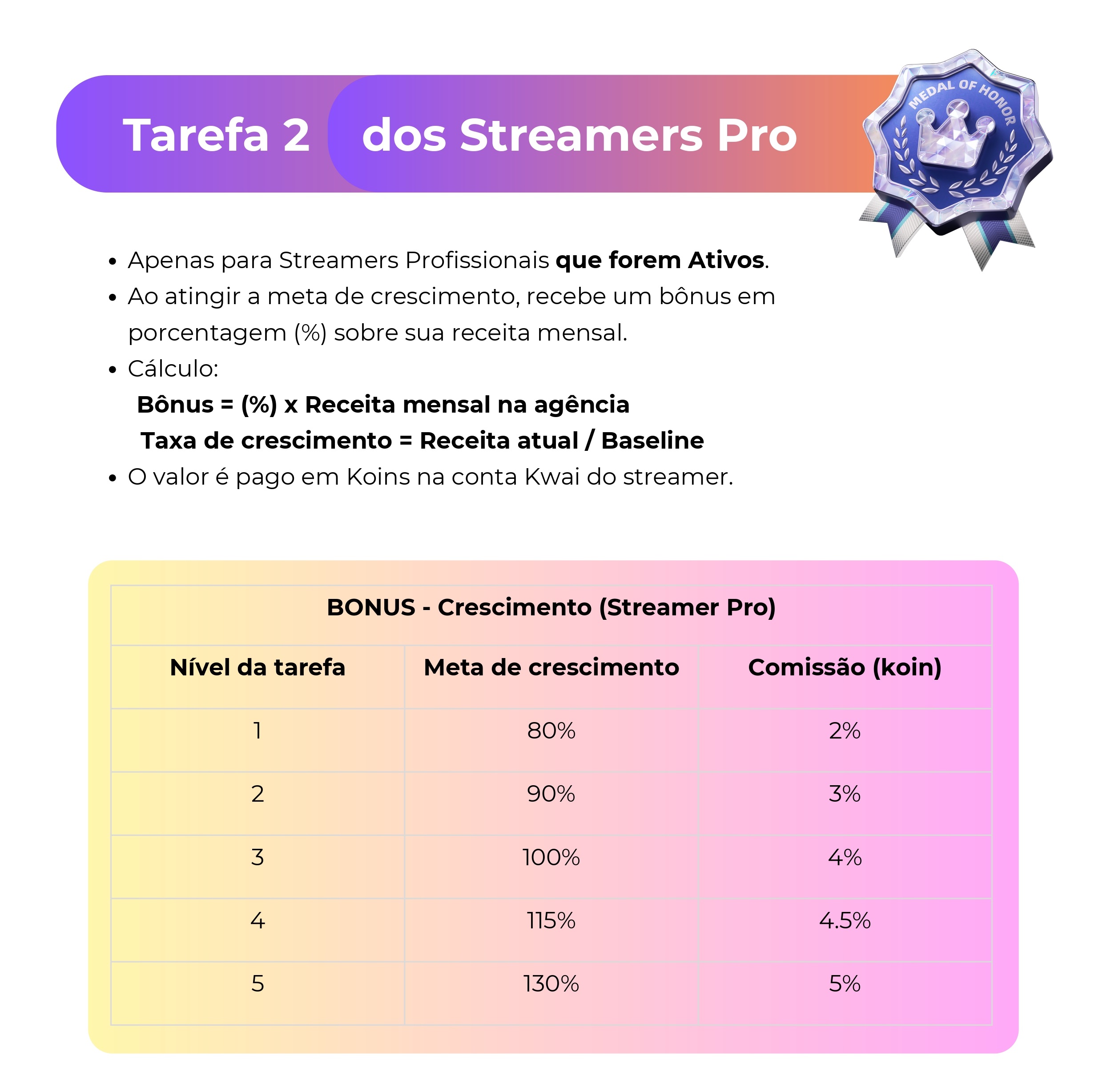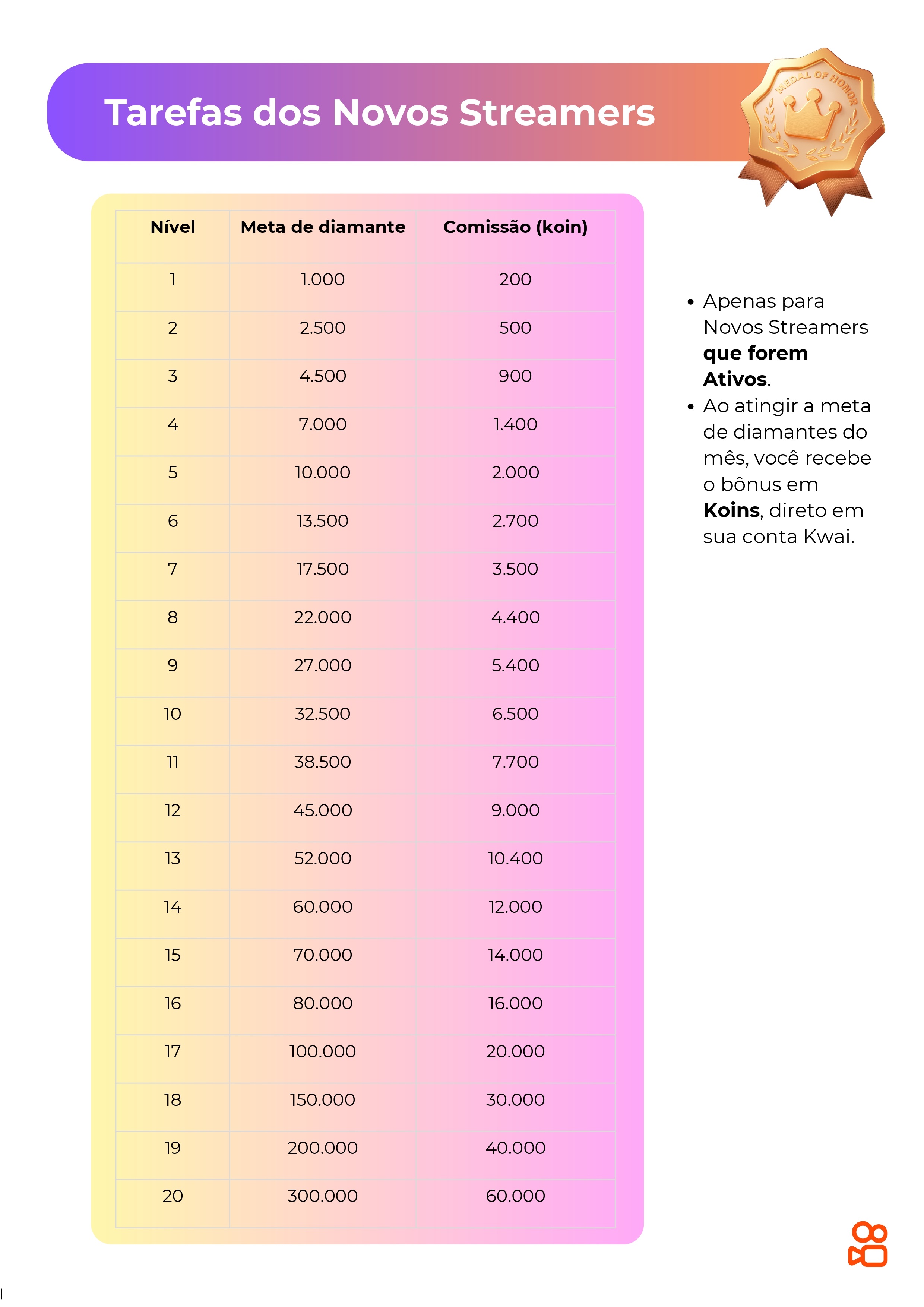 | Novo Streamer | Entrou na agência pela primeira vez nos últimos 3 meses e tem Baseline ≤ 150.000 diamantes. | Streamers avaliados mensalmente pela plataforma como Novos Streamers de Alto Potencial podem manter a classificação por até 6 meses (lista divulgada pela plataforma). |