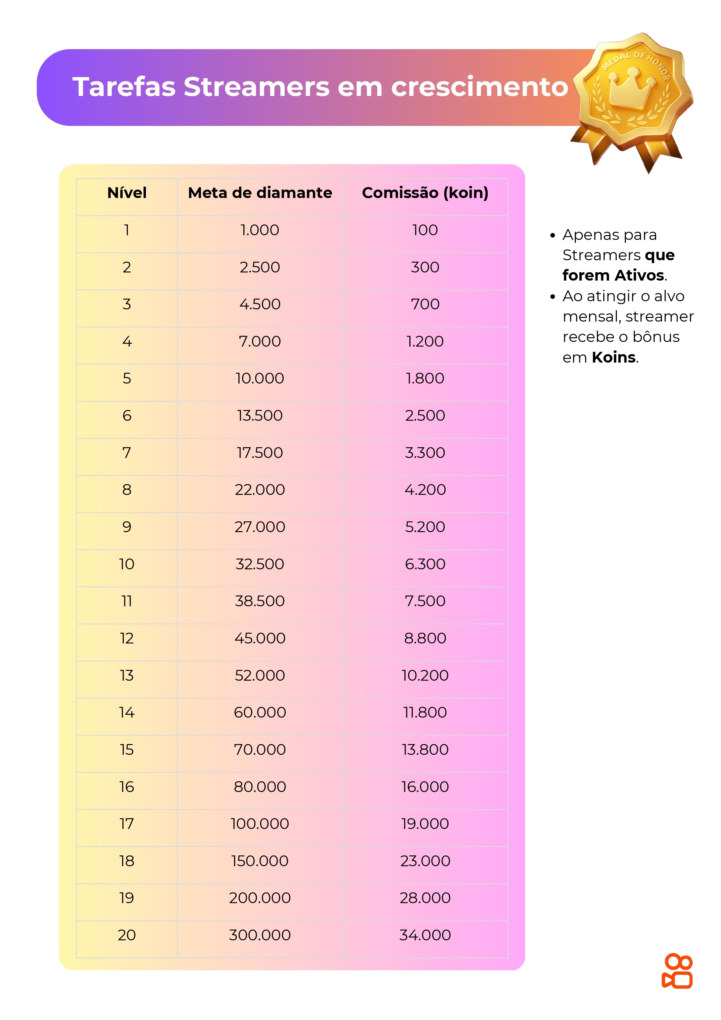 Para ser considerado Streamer Ativo no mês-calendário, é necessário: Receita em Diamantes ≥ 1.000 e cumprir os requisitos mínimos abaixo.